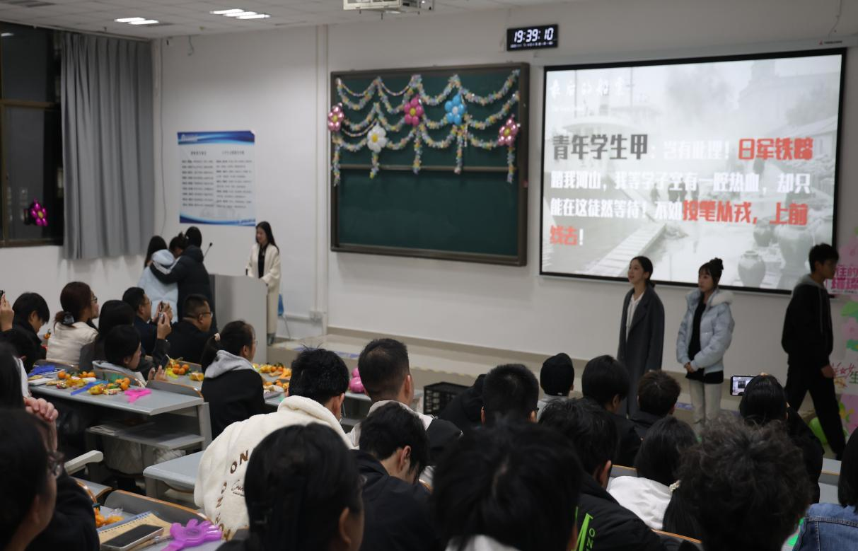晚会在25级文化产业管理班的激昂合唱中正式拉开序幕。同学们身着整齐服装,精神饱满、意气风发,以嘹亮又饱含深情的歌声演绎经典曲目。朴素的歌词里,藏着穿越时空的不变时代真理;激昂的旋律铿锵有力,响彻一号教学楼的每一个角落。歌声既生动唱出了中华民族从站起来、富起来到强起来的伟大飞跃,更真挚展现了新时代青年学子对党和国家的赤子情怀与忠诚担当,瞬间点燃现场氛围,为整场晚会奠定了昂扬向上的基调。