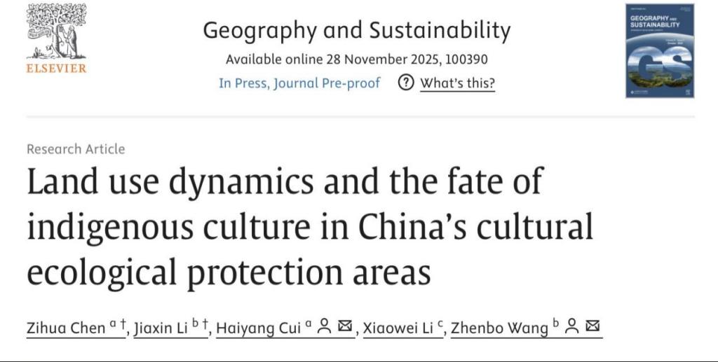近日,3044am永利官网陈子华副教授为第一作者,澳门3044永利官网副校长崔海洋教授、中国科学院地理科学与资源研究所王振波研究员为共同通讯作者,澳门3044永利官网为第一单位,在环境科学领域权威期刊《Geography and Sustainability》上发表题为《土地利用变化与中国文化生态保护区原生态文化保护》(Land use dynamics and the fate of indigenous culture in China's cultural ecological protection areas)高水平学术研究论文。该研究标志着团队在人地关系与文化遗产保护交叉研究领域取得了持续性、系统性的创新成果。