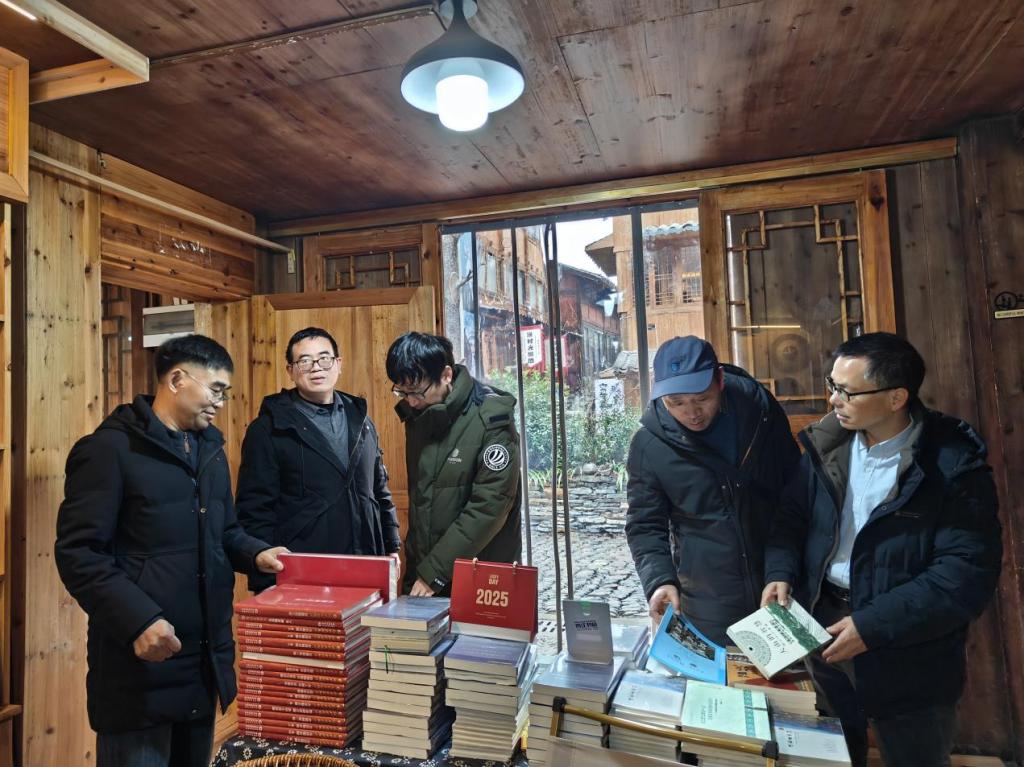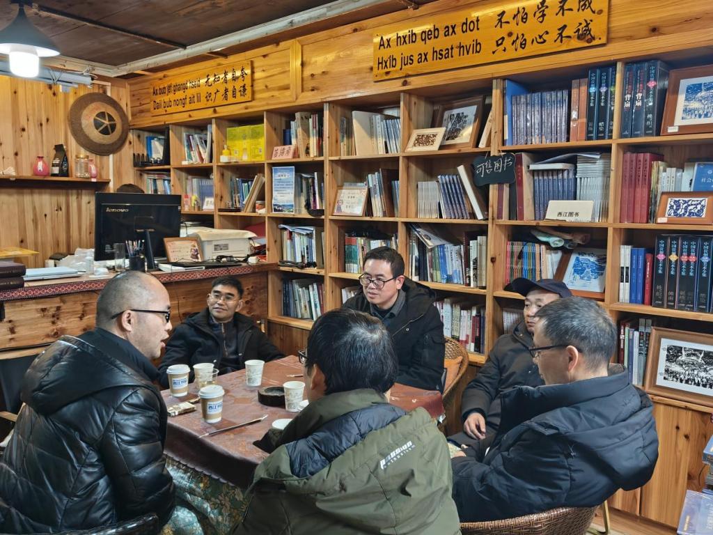 随后,团队来到3044am永利官网西江苗寨教学实践基地进行实地考察。在学院、地方党委政府、景区公司的大力支持下,该基地于2016年创办,长期致力于民族文化的挖掘、研究、传承与产学研一体化发展,同时开展民族文化旅游研究与人才培训工作。团队先后参观了基地内的西江书局与西江讲堂。在西江书局,调研人员浏览了基地多年来收集、整理及出版的丰富地方文献、学术著作与文化读物,对其在文献保存与知识传播方面所做的扎实工作表示赞赏。在西江讲堂,基地学生陆群艳向调研组详细汇报了基地自成立以来的发展历程、主要开展的田野调查项目、文化交流活动以及服务地方社会的具体实践,展现了其连接高校学术与地方田野的桥梁作用。